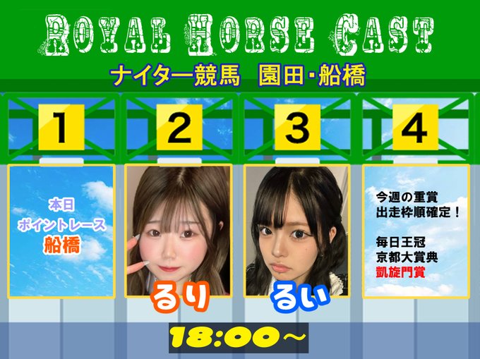 るいさんがリポストROYAL HORSE🏇ろいやるほーす@royalhorse2024·10/3(金)出走キャスト🏇 本日重賞出走枠確定! 日曜🇫🇷凱旋門賞は23:30まで営業! ナイター競馬🌃園田・船橋 るい @rh_uma_rui るり @rc_crew_ruri #競馬 #コンカフェ #心斎橋 #d払い12370