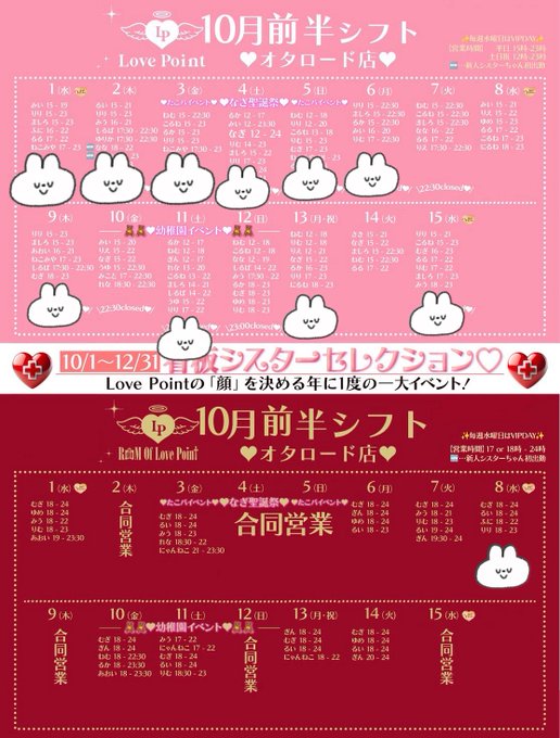 固定りり@ラブポイント@LP_ririsan·遅くなりました!> < ՞ 10月前半のシフトです! 鬼出勤しているので是非逢いに来てくださいっ☆*。 幼稚園イベ📛👧1日しかいないのでレアです ♡゛ #コンカフェ #大阪コンカフェ #日本橋 #オタロード #心斎橋 #難波♡Cafe LovePoint オタロード店♡2307