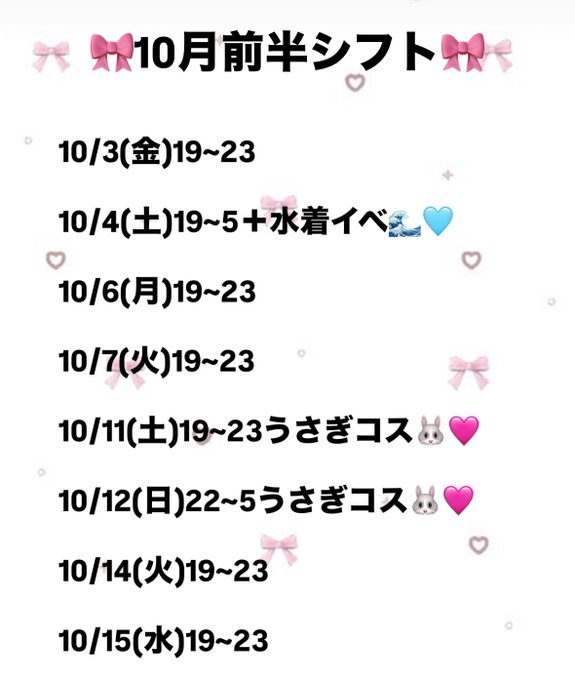 うにさん@あんじぇーる@LO8jXc·10月前半シフト 今月もいぱい会えるほしいです🌟 4日はゆりり生誕、絶対くることねー❕420382