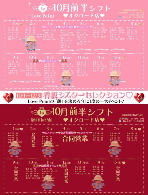 固定みづき!@mizuki390·10月前半シフト予定🤎 1日 18-23 2日 18-23 3日 18-23 4日 15-23 5日 17-23 さでまるさん周年イベ✨ 7日 18-23 8日 18-23 9日 18-23 10日18-23 11日 16-23 アーミーイベント💥 12日 16-23 アーミーイベント💥 13日 16-23 特別イベント💗 15日 18-23 13日よかったら遊びに来てほしいです🥹💞21418