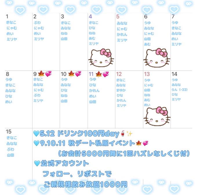 固定ナサ@nasa_p_s·⭐️10月前半シフト⭐️ 2(木)18-23 3(金)19-23 10(金)18-23 13(月)18-23 ♡7(火)そあさんリアバ🎂💖👶🏻1181