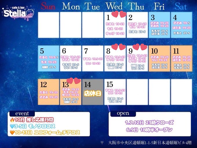 固定お殿@クラパラ@KlePala_otono·10月前半‼️‼️ これから出勤むちゃ減っちゃうから会える日いっぱい楽しもね︎;;!! 全部メイドロックさんにおる!! 後半も確実におれるの25日だけやからいっぱい会おね︎;;うーーー19292