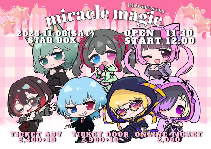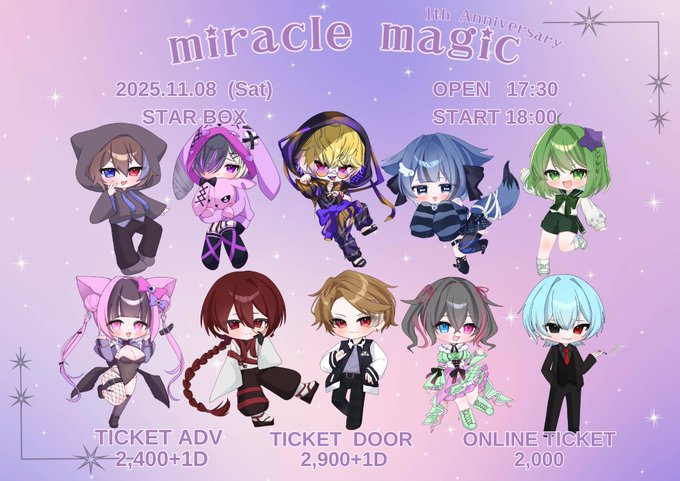 たんそく(𖦹' ')マル@ハナタバさんがリポストmiracle magic - 奇跡の魔法 -@__miramagi__·miracle magic - 奇跡の魔法 - 𝟏𝐭𝐡 𝐀𝐧𝐧𝐢𝐯𝐞𝐫𝐬𝐚𝐫𝐲 2025.11.08 STARBOX OPEN 17:30 START 18:00 前売 2,400+1D 当日 2,900+1D 配信 2,000 🎫 チケット発売日 10.12 21:30~ 各チケットのURLはツリーに記載してあります ※オムニバス形式となっております124232,251