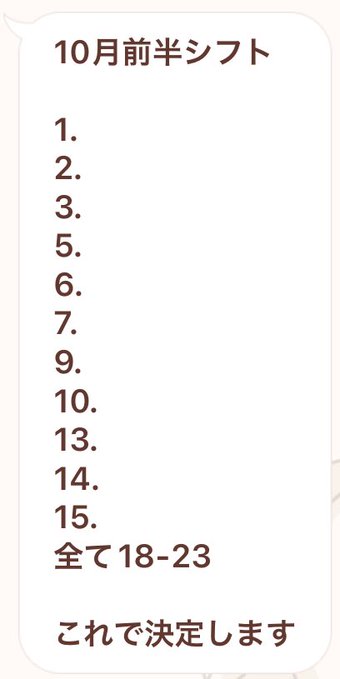 固定ヨ@yoru_p_s·10月前半シフト 1(水)18-23 2(木)18-23 3(金)19.5-23 5(日)18-23 6(月)18-23 7(火)18-23 9(木)18-23 10(金)18-23 12(日)18-23 13(月)18-2314190