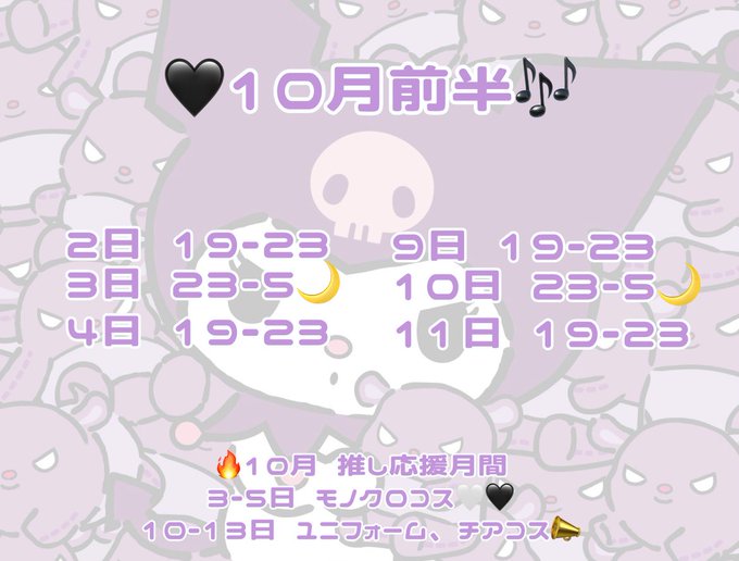 固定さき💬@saki__PS·〜10月前半シフト〜 10月後半はプラネットが Jカワナイト占領してやる予定です 10月17日(金)23時〜5時 10月18日(土)23時〜5時 両日メンバー別 把握よろしくお願いします7251