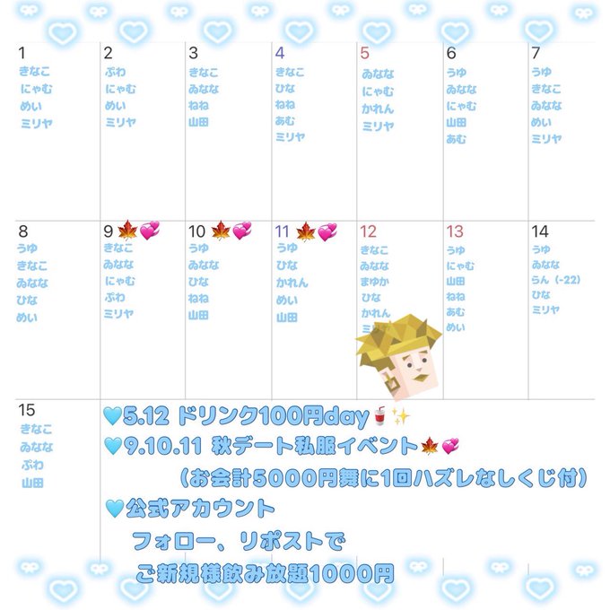 固定きなこ@_ki7wan_·10月前半会える日♡ 今までの1ヶ月分の出勤量を半月に詰め込んでみた👶🏻だからめーーーちゃいる!🙀みんな会いに来てくれるか不安🥲 あいにきてねー!!!🥲秋服いべんとあります🎵💕予定ください(>⩊