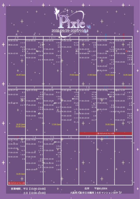 白玉つきみさんがリポスト🦋🧚♀️MaidCafe Pixie🧚♀️🦋@maidcafe_pixie·🧚♀️MaidCafe Pixie🧚♀️ 🦋10月前半お給仕予定🦋 ……✿……✿……✿……✿……✿……✿…… 10-13日 はしごイベント🥜 🧚♀️▶︎パジャマ ……✿……✿……✿……✿……✿……✿…… ※4日、5日、10日〜13日 土日祝イベント料金 ⚠️2日(木)MTGの為19:00オープン 沢山のご帰宅お待ちしております🧚♀️🪄124402