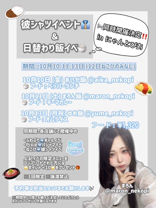 白玉つきみさんがリポスト🦋🧚♀️MaidCafe Pixie🧚♀️🦋@maidcafe_pixie·返信先: @maidcafe_pixieさん🥜はしごイベント Pixie▶︎パジャマ ふわぷり▶︎ギャル ねこぴ▶︎彼シャツ(12日除く) 同期間、各店舗にて開催中のイベントの限定メニューコンプリートで 『ポイント➕10』プレゼント🎁♥111235