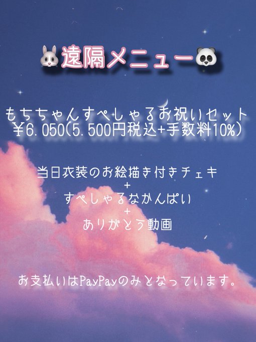もこ@メリメロ🐼💭10.4昇格祭🩷ྀི@moco_merimero·6時間🐰昇格祭メニュー🐼(もこver.) もこ初の主体イベント🎶お祝いに来るしかねぇなという感じで、メニューお待たせしました💭色々用意進めておりますので、ちょこっとだけでも覗きに来てくれたら嬉しいよ〜🥲遠隔メニュー画像のものとオリシャンもあります!!手数料だけかかっちゃいますが何卒💦引用もこ@メリメロ🐼💭10.4昇格祭🩷ྀི@moco_merimero·9月16日- ̗̀📢おしらせ🌈 この度、もちさんと私で昇格祭させていただきます‼️それに伴いまして、人生で初めてのオリシャン作らせて頂きます😉💭オリシャン予約してくださる方は、dmかリプまでお願い致します🫶1114638