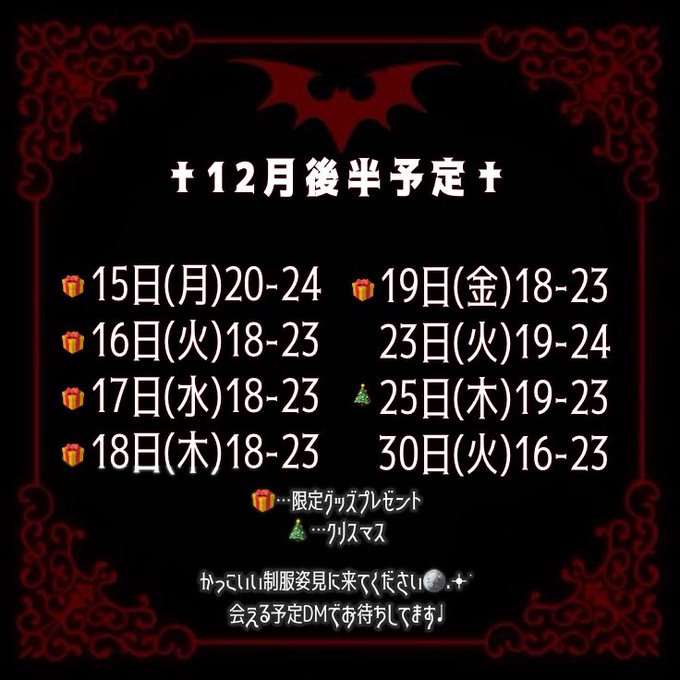 難波・日本橋 追憶のエクリプス固定クロネ🪙追憶のエクリプス@chlone_tsuieku·✝︎ 12月後半登校日 ✝︎ オープンの週走り切りますヨ・・・🎶 クリスマスと年末過ごしてくれる転校生さん@∞ です 僕と一緒にたのしい日々過ごしましょჱ̒ ᴗ ·̫ ᴗ 来校予定・登校リクエストdmまで✉️8222