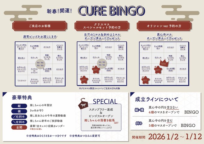 難波・日本橋 Cure Castle(キュア キャッスル)みづき!2/7さんがリポストCURE CASTLE🏰(キュアキャッスル)12/15.22店休日@Cure_Castle·12月16日【💎年末年始企画💎】 スタンプラリー&ビンゴを同時開催🌟 期間中ビンゴを揃えて豪華特典🎁 &スタンプを集めてお得な特典GET ✳️12月19日~カード配布開始 ✳️26日~スタンプラリー開始 来店するだけ❣️1日1個スタンプ🎁 ✳️1月2日~ビンゴ開始 マス内ミッションクリアで1マス🎁 ぜひご参加ください🌟引用CURE CASTLE🏰(キュアキャッスル)12/15.22店休日@Cure_Castle·12月12日19日・20日と24日・25日は クリスマスイベント🎅🏻🌟 アクキーやデカチェキなど 豪華特典付き🎁スペシャルセット🍽はご予約限定です💗 (締切は来店の2日前まで) ※フード単品はございません🙇♀️ 写メ付きミニシャン🥂 アクキー付き限定シャンパン🍾 囲み写メ付きSPテキ観🎡 サンタ姿でお待ちしてます❤️ x.com/cure_castle/st…6123,012