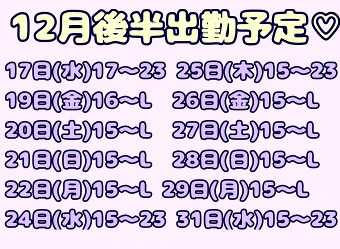 難波・日本橋 じゃぱにーずKAWAii固定るる(てぃえ)@lu_ru_jap·6時間お誕生日(リアバ)だったりご卒業🪐だったり色々イベント事多めなので公式要チェック❕引用るる(てぃえ)@lu_ru_jap·12月15日来店予定ください✊🏻 衣装は26日腹だしあり💙🖤、 27日王道❤️🤍です! お腹冷えたら隠しますスマヌ( '-' )1153