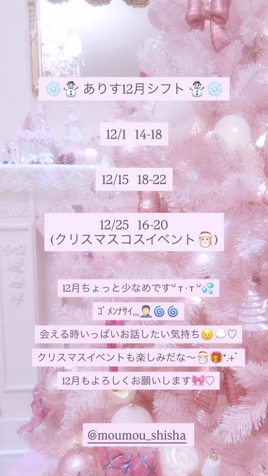 難波・日本橋 水煙喫茶moumou固定響 🤍12/17-moumou4周年🎉@moumou_hibiki·🕊12月お給仕予定🕊 早いもので今年ももう終わっちゃいますね今年も皆様のおかげでめちゃくちゃ楽しい1年でした!いつも本当にありがとうございます🌼12月、ちゃんと会って今年もありがとうって挨拶させて欲しい〜!! 12月も全力で楽しませて元気注入しちゃうからね😘💋 🩶→14時〜22時10951