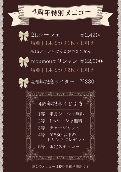難波・日本橋 水煙喫茶moumou唯🫸12/17 moumou 4周年🫷さんがリポスト水煙喫茶moumou -メイドシーシャカフェ-@moumou_shisha·いつも水煙喫茶 moumouをご愛顧いただき誠にありがとうございます。 おかげさまで当店は2025年12月17日に4周年を迎えることとなりました。 これもひとえに皆様からの温かいご支援とご愛顧の賜物と心より厚く御礼申し上げます 今後とも変わらぬご愛顧を賜りますようよろしくお願い申し上げます24264,074