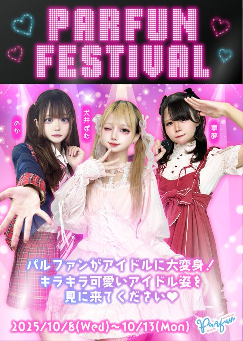 パルファン大阪店┃日本橋💐9/20グランドオープン❕@par_0808·✧꒰ イベント告知 ꒱✧ 10/8~10/13【🎤PARFUN FESTIVAL💐】 PARFUN大阪×MRC大阪×クロナイ! 3店舗でアイドルイベントが開催❣️ はしご特典もございます🎸🦇 限定メニューやグッズをご用意して お待ちしております✨ キラキラ可愛いアイドルに大変身したパルファンに、 ぜひ会いに来てくださいね🎶133