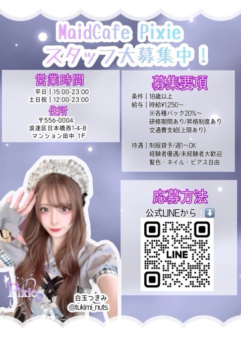 難波・日本橋 MaidCafe Pixie🦋🧚♀️MaidCafe Pixie🧚♀️🦋@maidcafe_pixie·スタッフ大募集❕ 画像をご確認の上公式LINEからご応募お待ちしております🎀 ご応募はこちらから⬇️♡ 【http://lin.ee/RrorMlu】 #コンカフェ求人 #日本橋 #コンカフェ募集 #メイドちゃん募集中40
