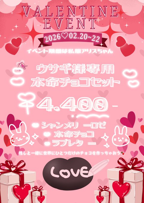 難波・日本橋 ~メイド喫茶~曖昧Alice~メイド喫茶~曖昧Alice🤍@I_my_Alice·3時間🍫💌引用~メイド喫茶~曖昧Alice🤍@I_my_Alice·2月16日⋱⋰ ⋱⋰ ⋱⋰ ⋱⋰ ⋱⋰ ⋱⋰ ⋱⋰ ⋱⋰ ⋱ 🍫2/20~22バレンタインイベント💝 数量限定本命チョコセットやイベントシャンパン特典などもりだくさん💌 本命チョコは世界にひとつだけのらくがき付き❣️ 皆様の迷い込みお待ちしております🐰♥️ ⋱⋰ ⋱⋰ ⋱⋰ ⋱⋰ ⋱⋰ ⋱⋰ ⋱⋰ ⋱⋰ ⋱1112