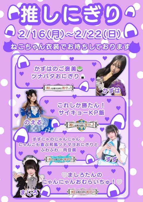 推し推せっ!コンセプトカフェ❦@oshiose_concafe·🔲2/16 営業時間 18:00-23:00🔲 推しは推せる時に推せっ!2号店 🍙推しにぎり🐈⬛❤︎ 推しつまみも同時開催中🐔🥢 18:00 のえる @noel_oshiose ここる @cocoru_oshiose めるあ @merua__oshiose 19:00 あい@ai_oshiose まひる @mahiru_oshiose ぽめ @pome_oshiose13111,027