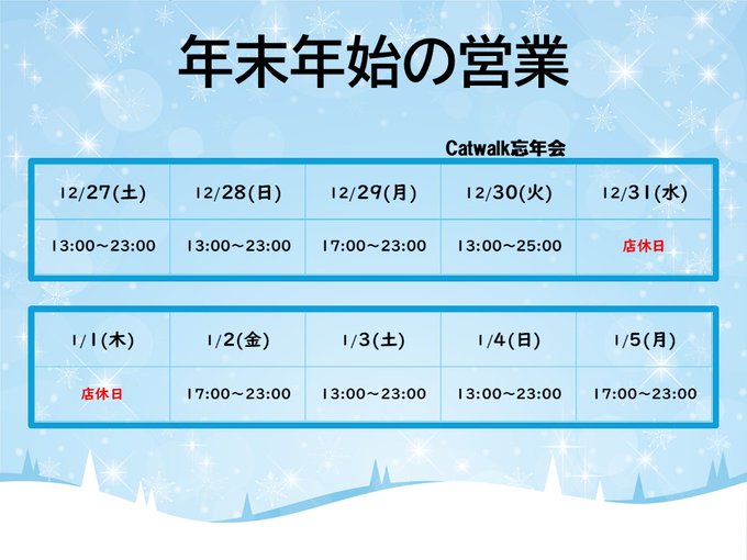心斎橋・ 宗右衛門 キャットウォーク CatwalkCat walk【キャットウォーク】@Cat_walk91·Catwalk 年末年始の営業時間48206