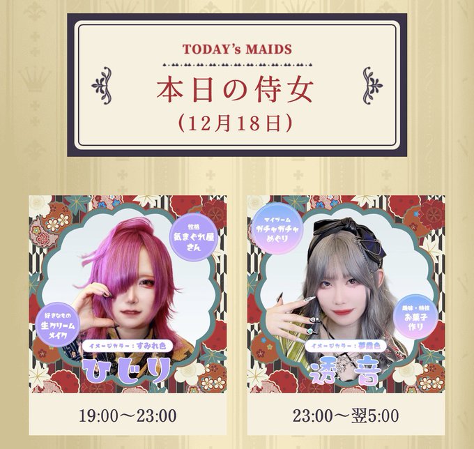 心斎橋・ 宗右衛門 Romantique(ろまんてぃーく) ミナミコンカフェ大阪ミナミのコンカフェ Romantique(ろまんてぃーく)@RomantiqueCafe·🌹本日:12/18の出勤侍女🌹 透音 @sukine_Beril ひじり @hijiri_roman 19:00〜OPEN✨ ご来館お待ちしております🫧 ▽公式HP https://romantique.moe ▽求人 https://romantique.moe/recruit/ #ミナミコンカフェ #大阪コンカフェ #コンカフェ嬢50