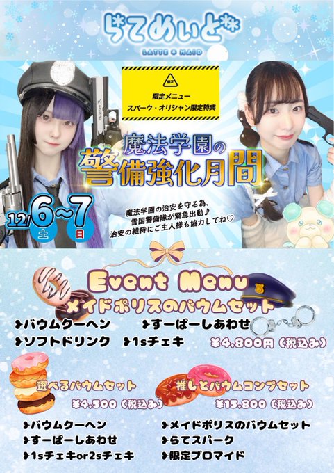 難波・日本橋 雪国のお絵かきメイドカフェらてめぃど雪国のお絵描きメイドカフェ らてめぃど 日本橋オタロード本店@lattemaid_otaro·❄️日本橋メイドカフェ『らてめぃど』Open❄️ ❄️12月7日(日)❄️ 🤍12-17 れみ@remi_latte 🤍12-22 くらん@kuran_latte ぷぅ@pwu_latte 🤍17-22 ふぶき@fubuki_latte ここ@coco__latte2 ご主人様、お嬢様の ご入国をお待ちしております❄️227455