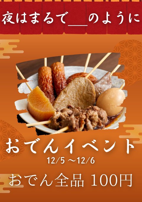 心斎橋・ 宗右衛門 夜はまるで――のように夜はまるでーーのように |道頓堀・宗右衛門町店さんがリポスト神風フラン@Scarlet_Devil26·🌙夜はまるで___ように🌙 フード担当のフランです🤗 いよいよ寒くなってきて 温かい料理が食べたくなる季節‼️ 🍢おでんイベント🍢 12月5日〜12月6日 🌈限定フード🌈 ・おでん全品 ¥100✨ 数に限りがあるので無くなり次第 その日は終了となります🙏 皆様のご来店お待ちしております✨ #夜はまるで67331