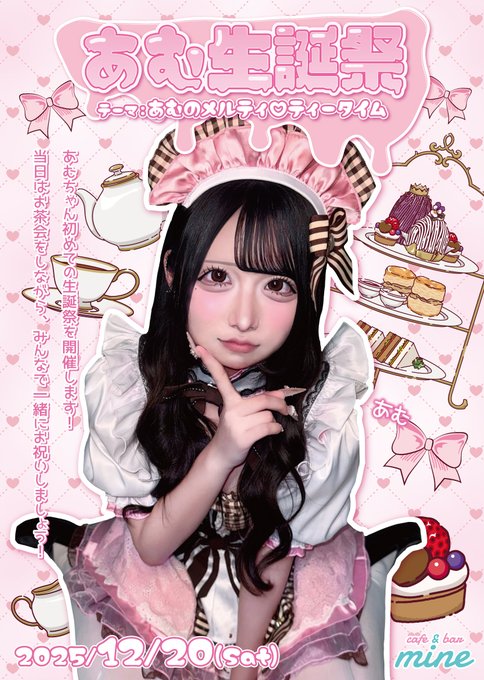 難波・日本橋 まいんまいん🎀いもうとコンカフェ@mine1201_·🎀まいんいべんとにゅーす🎀 【あむ生誕祭~あむのメルティ♡ティータイム~】🫖 💗2025/12/20 あむちゃん初めての生誕祭をmineで開催いたします🧁🍰 甘々なmineであむちゃんをお祝いしましょう✨ 沢山のご帰宅おまちしております3167