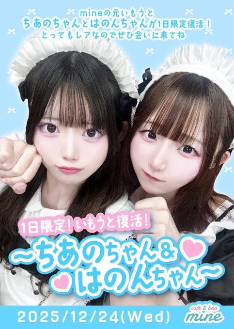 難波・日本橋 まいんまいん🎀いもうとコンカフェ@mine1201_·🎀まいんいべんとにゅーす🎀 【1日限定❣️いもうと復活❣️ ~ちあのちゃん、はのんちゃん~】 💌2025/12/24 とってもレアないもうと1日復活DAY🎶 お見逃しなく✨✨3187