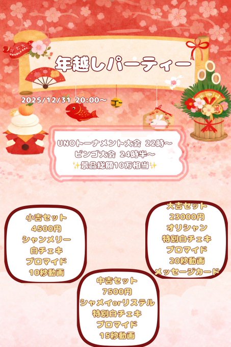難波・日本橋 くりーむくりーむ♡大阪コンカフェ♡@pome_098·🎍✨年越しパーティー開催✨🎍 2025年最後はみんなでカウントダウン🥂年越しはぜひ【くりーむ】で🤍 🗓 12/31(火)20:00〜 🎮 22:00〜 UNOトーナメント大会 🎉 24:30〜 ビンゴ大会 💰 景品総額10万円相当✨ 年末限定の特別セットもご用意してます🎁一緒に2026年迎えよ〜₍ᵔ· ̫·ᵔ₎♡さらに表示2154