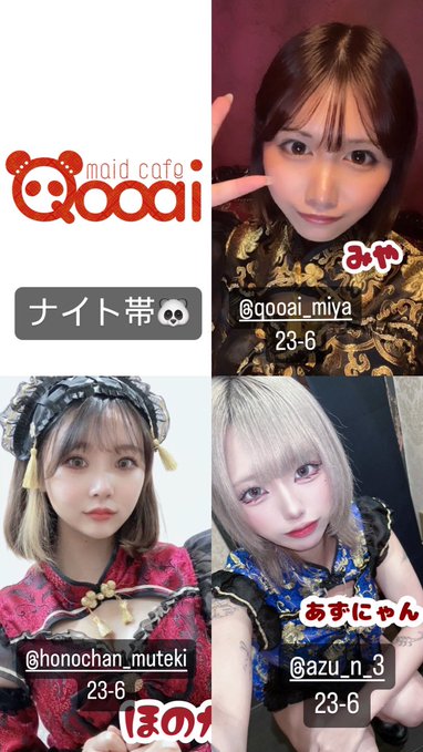 Qooai 心斎橋ミナミ本店【コンカフェ】@Qooai_·🐼本日のQooai心斎橋 ログインキャストさん🐼 ◇うい @u1c_n_ 18-23 ◇たかはし @Q_tkhs 18-23 ◇ぽに @poninyamu 18-23 ◆みや @Qooai_miya 23-6 ◆ほのか @honochan_muteki 23-6 ◆あずにゃん @azu_n_3 23-6 ミナミにあるコンカフェ Qooai -クーアイ- ご入国お待ちしております🐾 ---さらに表示2248
