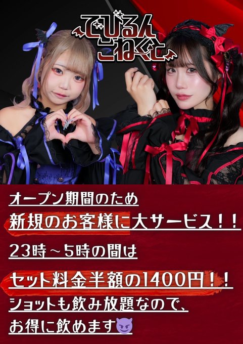 でびるんこねくと@devilnconnect·23時以降のサービスが熱い ご新規様は23時以降の1時間のセット料金が 半額の1400円✨ ビール飲み放題の場合は+500円! #コンカフェ営業ください #コンカフェ営業 #宗右衛門町 #大阪ミナミ12204