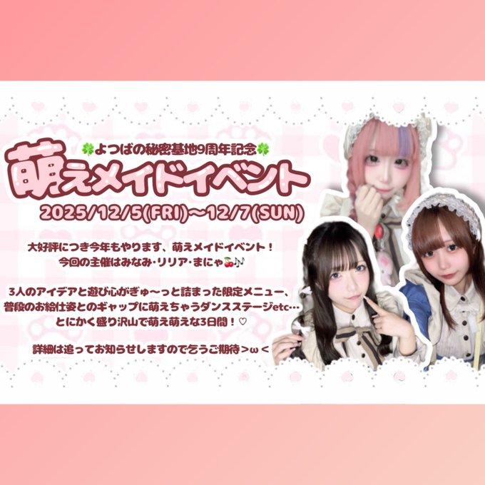 難波・日本橋 よつばの秘密基地大阪なんば日本橋@よつばの秘密基地さんがリポストみなみ🐶🍮よつばの秘密基地@yotuba_minami·☁️プチお知らせ☁️ 萌えメイドイベントの企画担当させていただきます🎀 皆さまに楽しんでいただけるようにあれこれ悩みつつ、でもとてもワクワクしながら準備しています! 当日、たくさんのご訪問お待ちしております^>𐋣