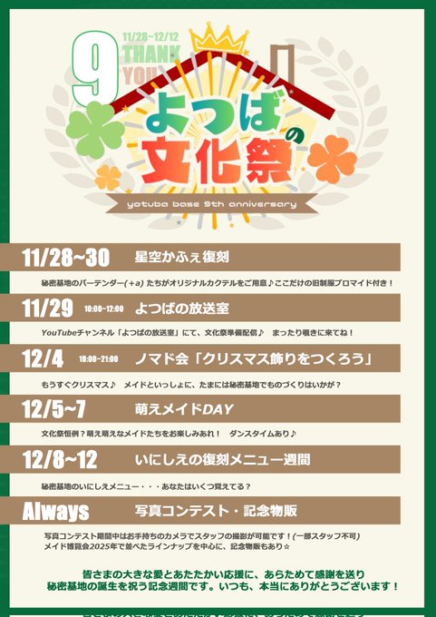 難波・日本橋 よつばの秘密基地固定大阪なんば日本橋@よつばの秘密基地@yotubabase·【🍀よつばの文化祭2025🍀】 皆さまのあたたかいエールのおかげで よつばの秘密基地は9周年を迎えることができました🙇♂️✨ かわらない感謝をお返しすべく 11/28〜12/12 メイド&バーテンダーたちが さまざまな催し物をご用意致します これからも #よつばの秘密基地 を よろしくお願いいたします💐11164,341