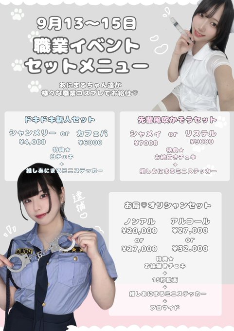 あにまる♡みるふぃ〜ゆ@animilu_1·🩷本日のあにまる🩵 🚨職業イベント2日目💉 めう 16-21 @meu_anml あくむ 16-21 @akumu_anml せな 16-21 @sena_anml にゃんちわ 17-23 @nyanchiwa_anml 海 18.5-23 @meru_anml ねお @neo_inarinya 春麗 @chunry_anml ♡遠隔ショップ https://anml.base.shop45828