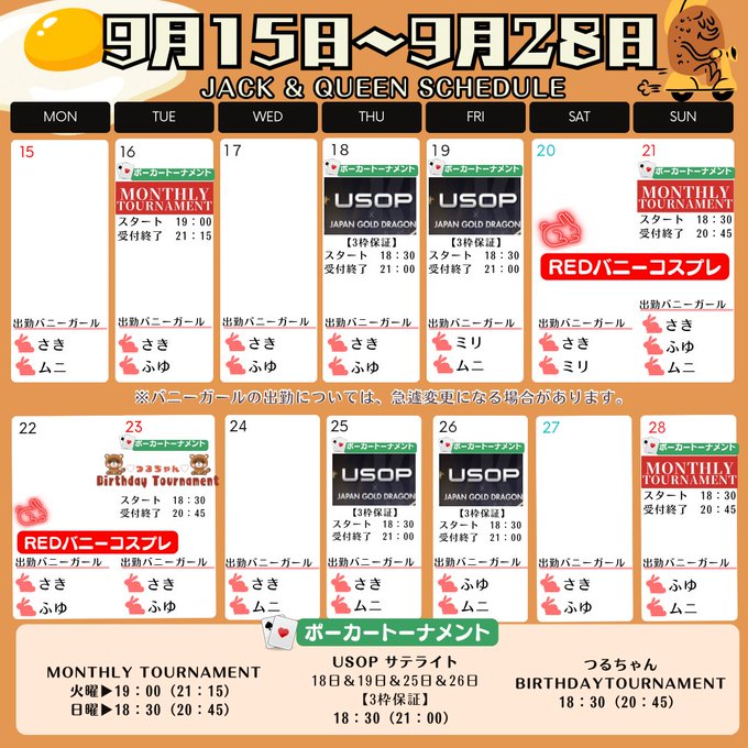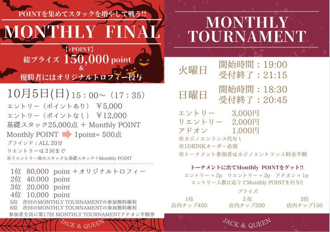 固定Jack&Queen👯♀アミューズメントカジノ@JQosaka·🌟9月15日~9月28日スケジュール🌟 毎週火、日曜日 開催 MONTHLY TOURNAMENT (ポーカー) 火曜➡開始19:00(~21:15) 日曜➡開始18:30(~20:45) エントリー¥3,000- ※1ドリンクオーダー制 入賞者には店内チップ🎁 マンスリーポイントは、MONTHLY FINAL初期スタックに追加‼️さらに表示11193