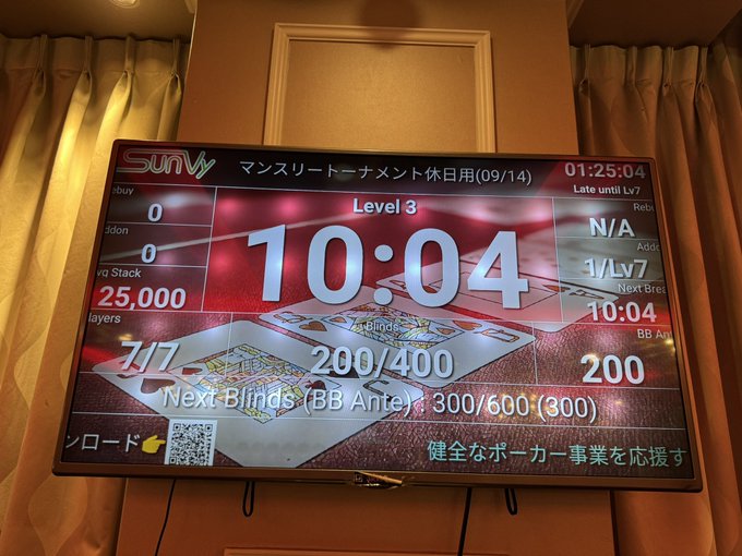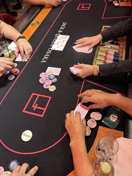 Jack&Queen👯♀アミューズメントカジノ@JQosaka·5時間7名様で進行中です✨ 200/400/200 受付終了時間は20時45分です! ご来店お待ちしております👯♀️✨引用Jack&Queen👯♀アミューズメントカジノ@JQosaka·5時間♥MONTHLY TOURNAMENT♠ ⏰開始時間 火曜日19:00 日曜日18:30 ⏰受付終了 火曜日21:15 日曜日20:45 💰エントリー 3,000円(25,000点) 💰リエントリー 2,000円(25,000点) 💰アドオン 1,000円 (15,000点) ※1ドリンクオーダー制 ※エントランス料なし ※カジノ参加の場合エントランス半額114
