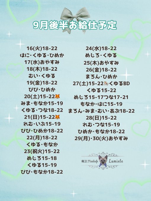 𝐋𝐮𝐦𝐢𝐞𝐥𝐞🪄︎︎魔法メイドカフェルミエル@Lumiele_maid·୨୧┈┈┈┈┈┈┈┈┈୨୧⑅*。 魔法maidcafe Lumiele 9月後半お給仕予定表🪄⌒♡ 🐇➰Event➰🐇 20(土)21(日)お月見🌕巫女イベント 27(土)くゆるちゃんBD 皆様のご帰宅を心よりお待ちしております。134457