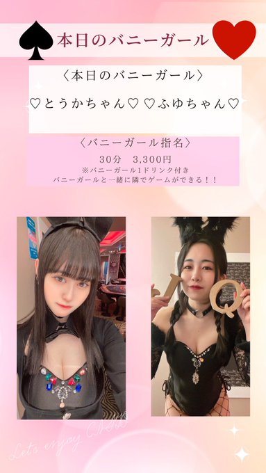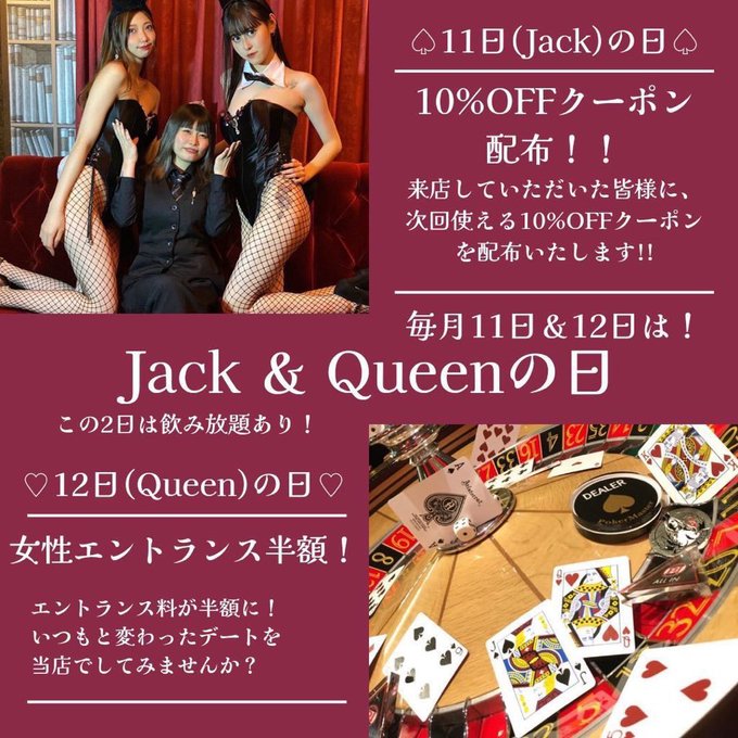 Jack&Queen👯♀アミューズメントカジノ@JQosaka·Jack&Queen👑OPEN 18:00〜24:00(L.O. 23:20) 本日のバニーガール🐰 👯♀️ふゆちゃん 👯♀️とうかちゃん ⭐エントランス カジノ ¥3,000+1Drinkオーダー制 バー ¥1,500+1Drinkオーダー制 💰チップ ¥2,000〜 $100〜 ➡チップはグループで共有可能! ※チップは現金やギフトに交換はできません。さらに表示203