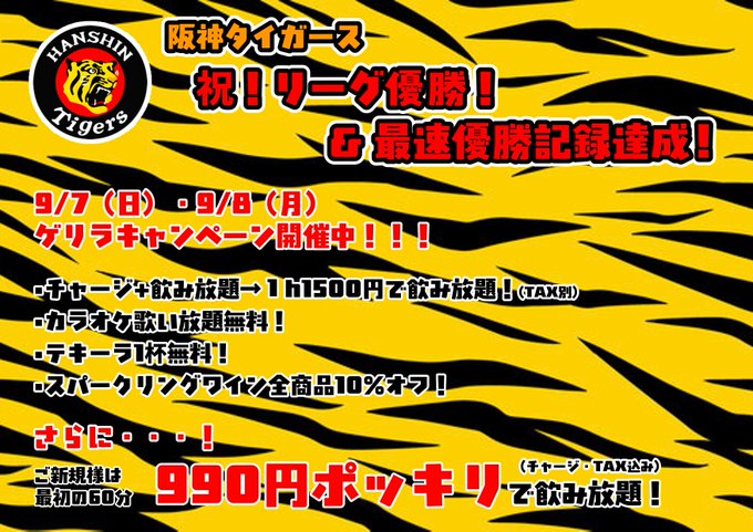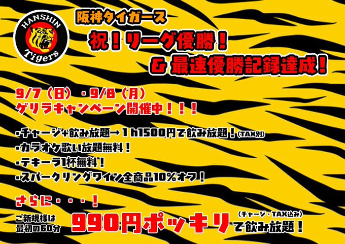メイドBAR ほ〜むめいどさんがリポストCafe&Bar Nuts(ナッツ)@CafeBarNuts·㊗阪神タイガース リーグ優勝&記録達成🎊 ゲリラキャンペーン開催中🌟 9/7(日)、9/8(月)の2日間 なんと 飲み放題半額‼️ &その他特典あり‼️ さらにご新規様は 最初の60分990円ポッキリで飲み放題🤩 詳細は画像をご覧下さい👀 #阪神タイガース #優勝 #記録達成 #リーグ優勝 #割引 #イベント514450