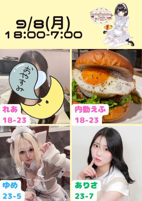 CCC -Cutie Cuisine Cafe-@大阪ミナミのお料理コンカフェ@cutie_cuisine·♡9/8 今日会える料理人♡ 内勤えふ18-23 @ccc_fchan ゆめ 23-5 @Yumesan_q ありさ 23-7 @genkai_insyu 本日もお待ちしてます(ᐢ∩ ̫