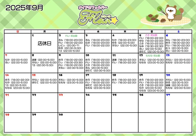 固定メイドカフェ&バー フルール@cafebarfleur·🌟9月出勤予定表🌟 (2025/9/9更新) 『ご新規様』は割引あり💰 ❤️求人大募集中!!!❤️ ▪︎17歳以上の女性 ▶︎▶︎▶︎詳細は画像をご覧下さい👀1196