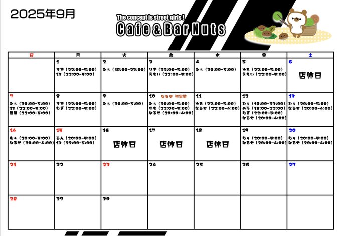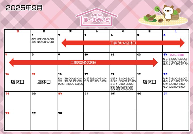 固定メイドBAR ほ〜むめいど@homemade_osaka·🏠9月出勤予定表🏠 (2025/9/9更新) 9/2〜9/12の間 工事のため店休日とさせて頂きます👷 その間 当店キャストは 系列店に出勤致しますので よろしくお願い致します🙏 【フルール】 @cafebarfleur 【Nuts】 @CafeBarNuts ❤️求人募集中❤️ ■17歳以上の女性 ▶︎▶︎▶︎詳細は画像をご覧下さい👀179