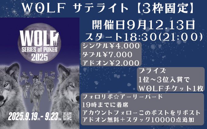 Jack&Queen👯♀アミューズメントカジノ@JQosaka·🐺WOLF【3枠固定】サテライト🐺 🗓9月12日(木)13日(金) ⏰開始時間 18:30 ⏰受付終了 21:00 📞06-6634-2577 👯♀️3名様集まり次第開催‼️ 💰エントリー(SINGLE) ¥4,000 ➡STACK 25,000点 💰エントリー(DOUBLE) ¥7,000 ➡STACK 50,000点 💰アドオン ¥2,000 ➡STACK 20,000点 ※1ドリンクオーダー制さらに表示23