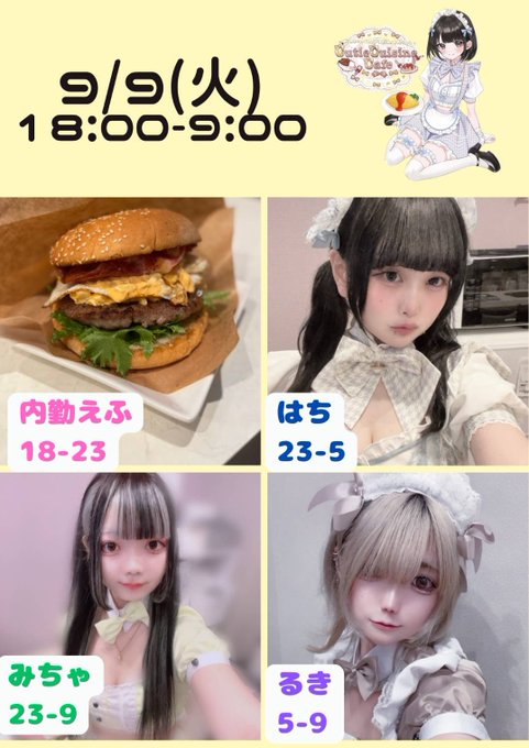 CCC -Cutie Cuisine Cafe-@大阪ミナミのお料理コンカフェ@cutie_cuisine·♡9/9 今日会える料理人♡ 内勤えふ18-23 @ccc_fchan はち 23-5 @_hciiico みちゃ 23-9 @michan__ccc るき 5-9 @narunaru_0_ 本日もお待ちしてます^ >ᴗ