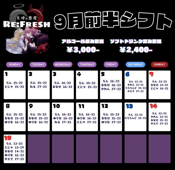 cafe & bar Re:Fresh@Re_Fresh_otr·今日の出勤予定は らん 15-22 @_rantam_ ななせ 15-22 @nanase7979 ゆりな 16-22 @yrn__16 です!1277