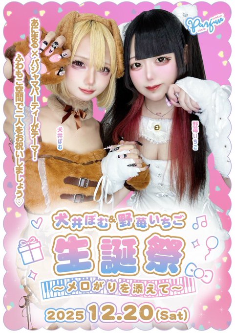 難波・日本橋 パルファン 大阪店パルファン大阪|日本橋🧚香水の妖精コンカフェ@pfosk_0920·💐イベント情報💐 2025/12/20(土) 🐾犬井ぽむ&野苺いちご生誕祭🍓 〜メロがりを添えて〜 *:..。♡*゚¨゚゚・*:..。♡*゚¨゚゚・*:. 犬井ぽむちゃんと野苺いちごちゃんの生誕祭を合同で開催します❕ テーマは『あにまる×パジャマパーティー』 みんなで盛大にお祝いしましょう🩵🤍21201
