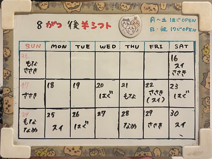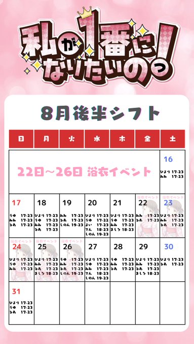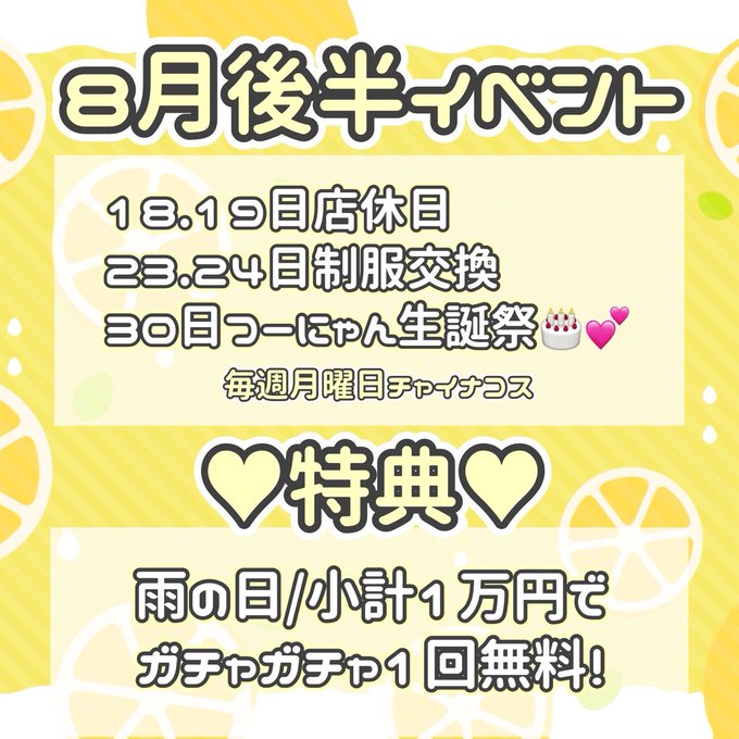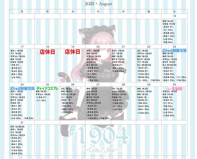 固定Cafe&Bar#1904@cafebar_1904·8月後半シフトです❕ 18.19日 店休日 23.24日 ぷりゅむ制服交換イベント🪄︎︎✨ 30日 つー生誕祭🎂🩷 毎週月曜日 チャイナコスプレ🇨🇳 雨の日/小計¥10,000-以上でガチャガチャ1回無料❣️ 8月後半もよろしくお願いします🙇♀️1111,140
