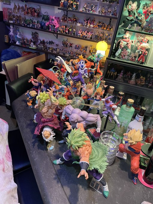 ドラゴンボールBARひゃっくん@masa00622·ケース届くまで待てずに 家からお店にフィギュア運んだので カウンター席が大変な事にw フィギュアの隙間にコップ置いて飲んでね #ドラゴンボール #ドラゴンボールバー3602,565