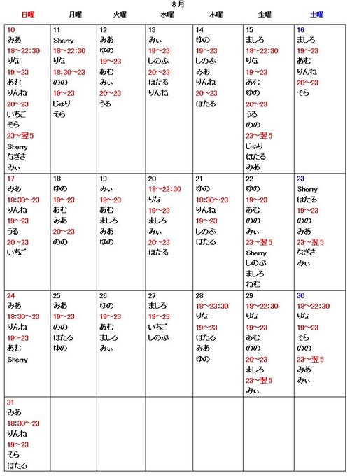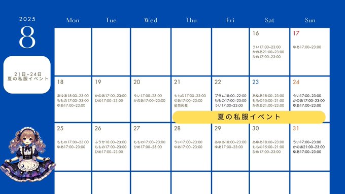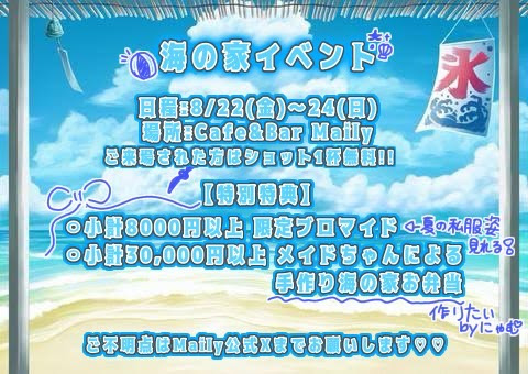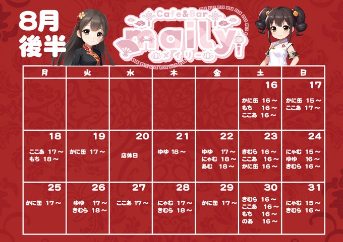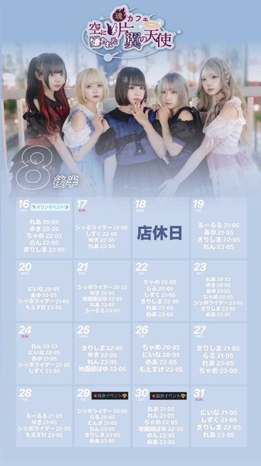 固定cafe & bar maily(メイリー)@maily202411·【✨メイリー✨8月後半シフト】 8月後半は海の家イベント、きむらちゃんお誕生日会など盛りだくさんです! 皆様のご来場お待ちしております💝 #コンカフェ #コンカフェキャスト #難波 #日本橋 #オタロード #メイドカフェ #コンカフェ嬢 #コンカフェ求人4160