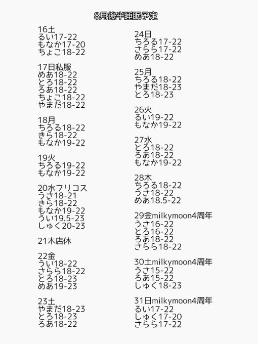 固定milkymoon🥛🌙@milkymoon_osaka·8月後半睡眠予定4151,399